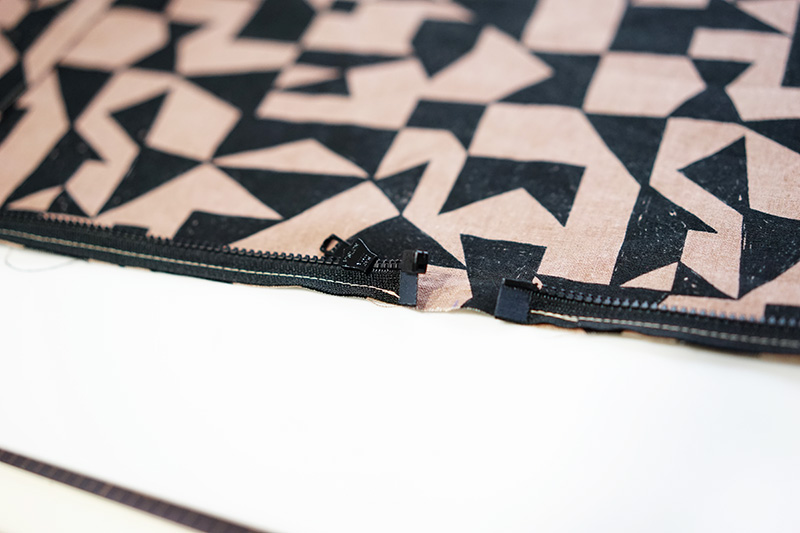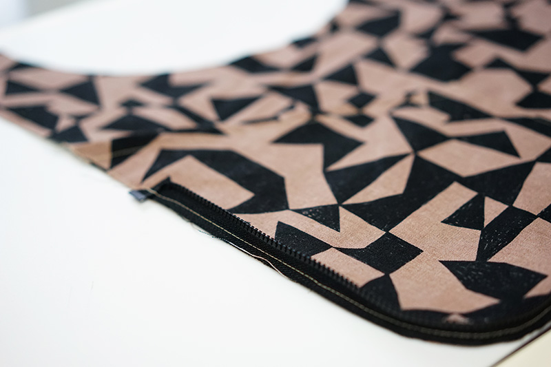 0.5cmの縫い代で仮縫いします。ファスナー終わり(上止側)は外向きに折っておきます。反対側も同様に。