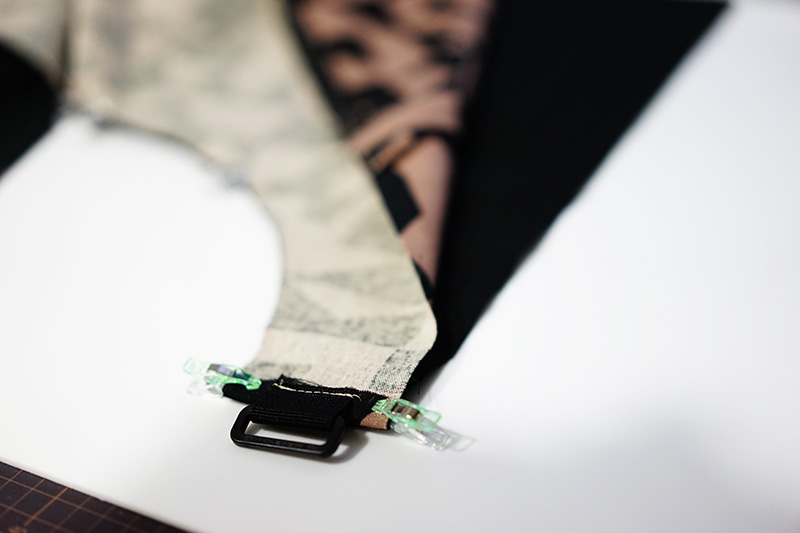 角カンは外側に出しておき、縫い代は1cm折っておきます。
