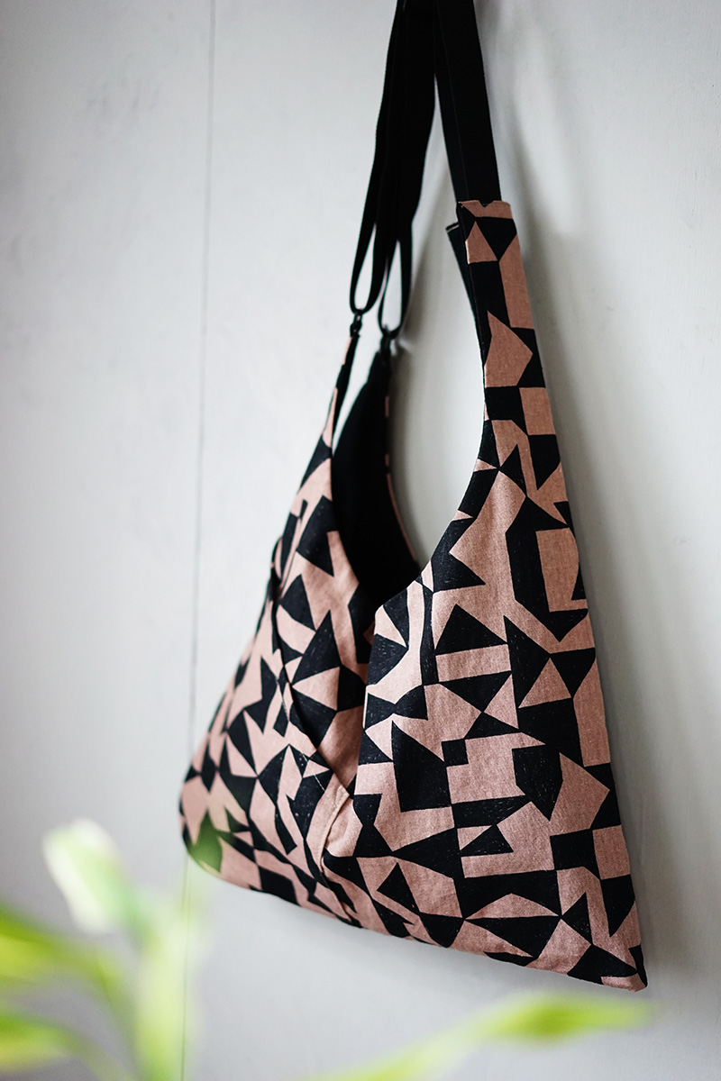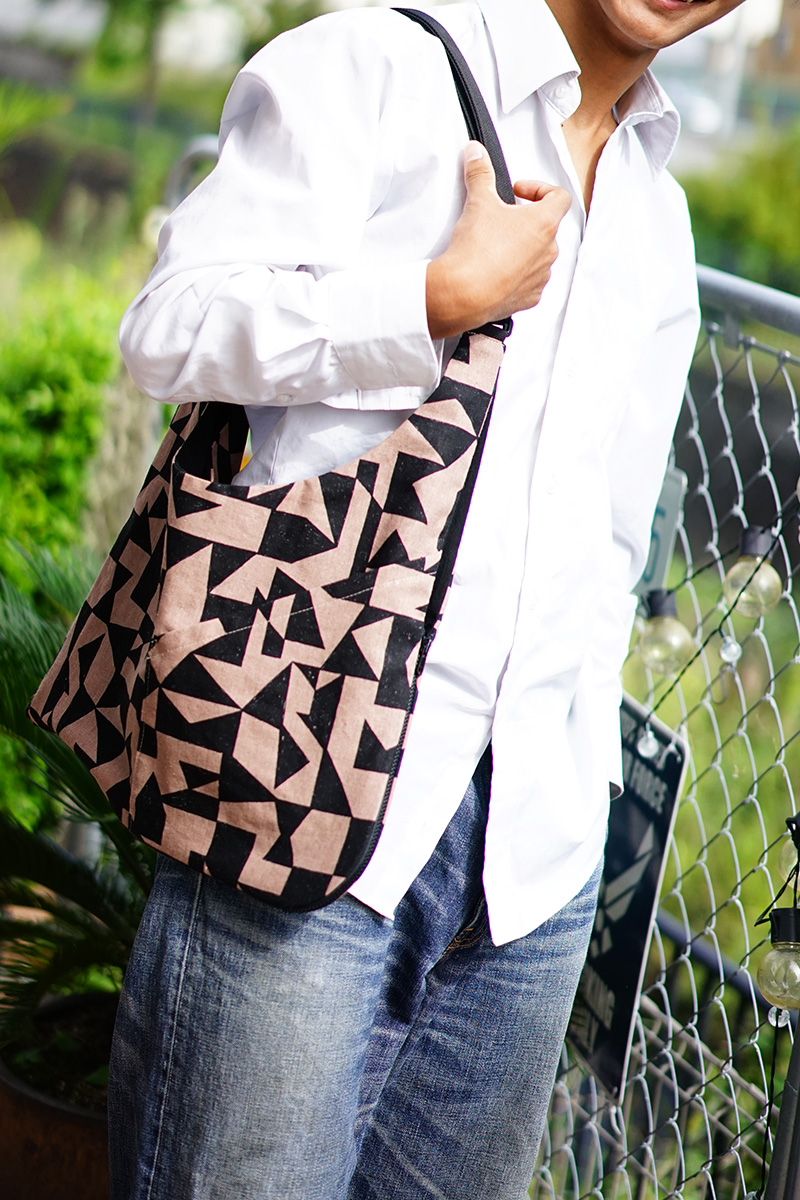 ベストのように着れちゃうユニークなバッグです。ポケットつきなので、作業ポケットとしても使えます。使った布はechinoのセカンドブランド「ni-co」シリーズ、さまざまな図形が組み合わされたような[patch]。無機質なモチーフと寒色系をメインとした色づかいなので、ジェンダーレスで使いやすいのが魅力です。張りのあるしっかりした綿麻キャンバス生地なので、バッグはもちろんエプロンやクッションカバー、雑貨小物など幅広く使えます。