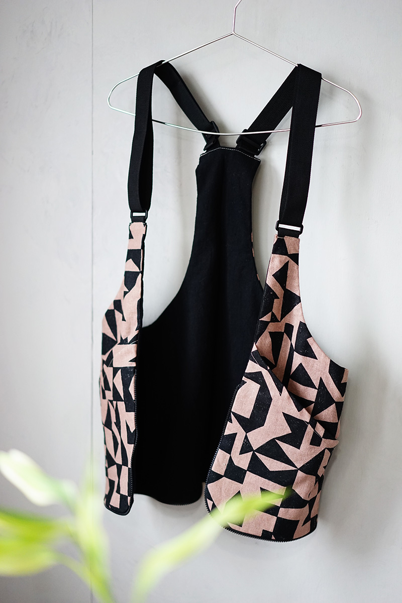 おしゃれアイテムとして使えて、かつ便利なものを…と考えました。フィッシングベストのようなカジュアルな形で、作業ポケットとして使える便利な作品。ファスナーをとじるとバッグにもなる、楽しいデザインにしました。
