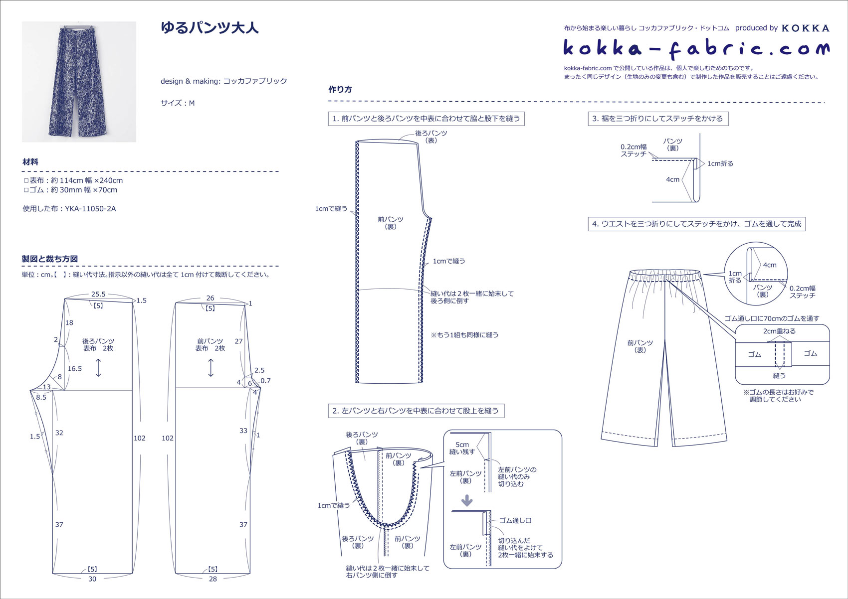 おうちでくつろぐリラックスタイムや、ちょっとそこまでのお出かけにぴったりのパンツです。ウエストゴムなので初心者さんでも簡単に作れます。使った布は「Monpex」シリーズ。涼感素材の楊柳はこれからの季節におすすめです。