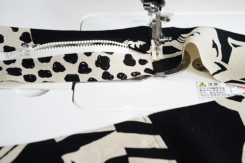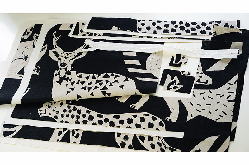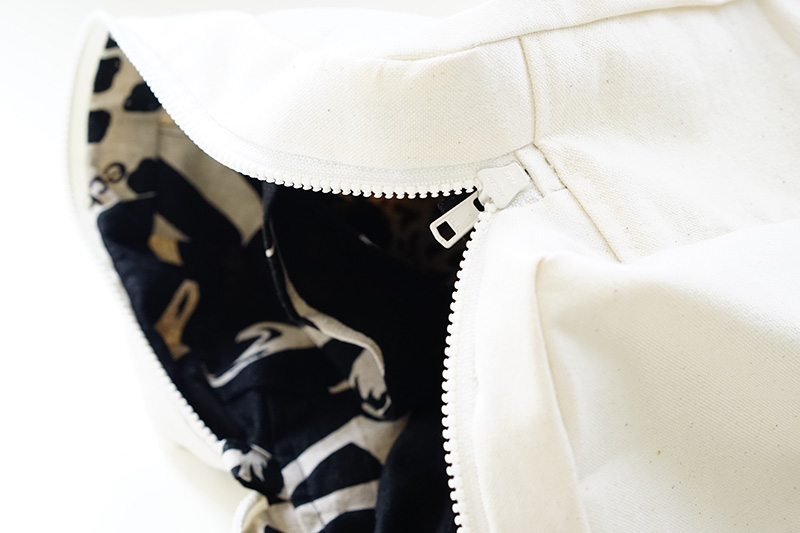 インパクト大の大きなアニマル柄をそのまま生かしたバッグです。40cmのファスナーを使っているので荷物もたっぷり入ります。使った布は、echinoの「Framework 2022」シリーズの[LIVE]。動きのある大柄なのでトリミング場所によって、さまざまな雰囲気が楽しめます。綿麻キャンバス。