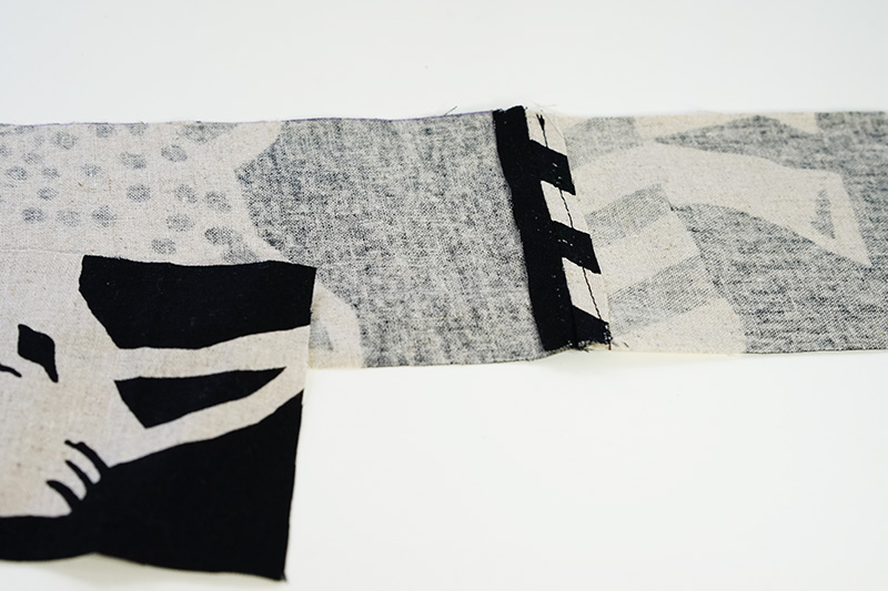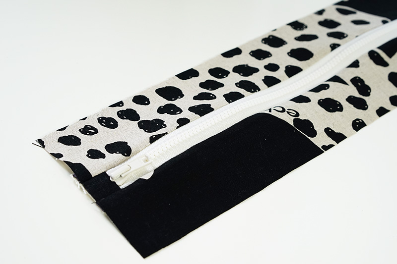 ファスナー端にあて布を縫いつけます。ファスナーに合わせて余分はカットします。