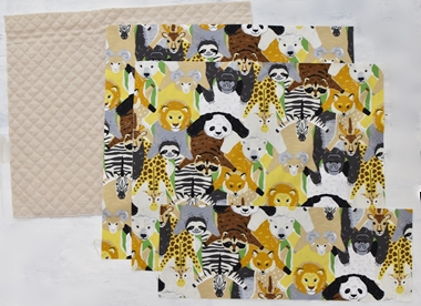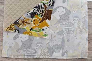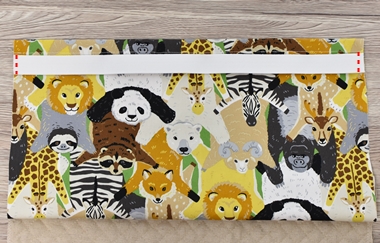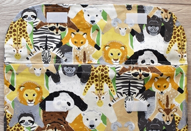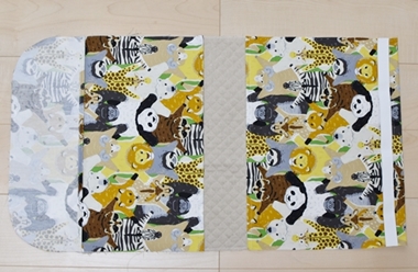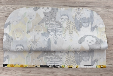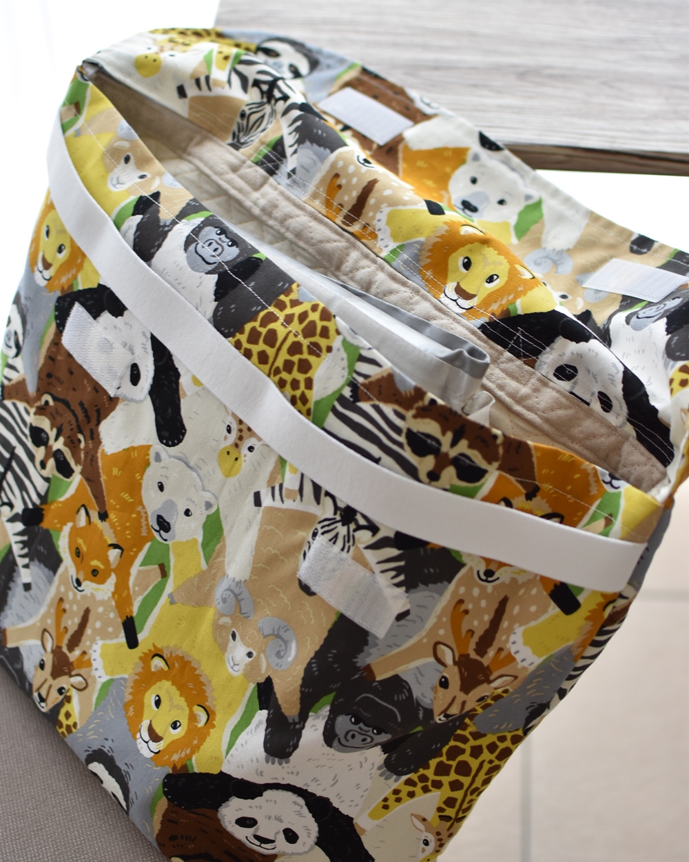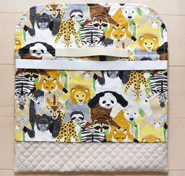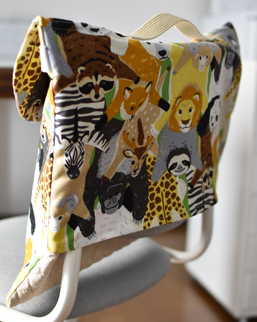 動物がそれぞれニコっと微笑んでいるイラストがとてもかわいらしく、見ていて元気の出る生地だったのでスクールグッズに仕立ててみました。