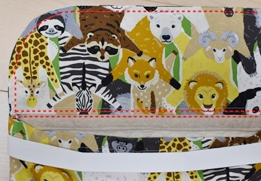 3のカバー布の底部分(直線部分)を1cmの三つ折りにして端から0.7cmのところを縫います。