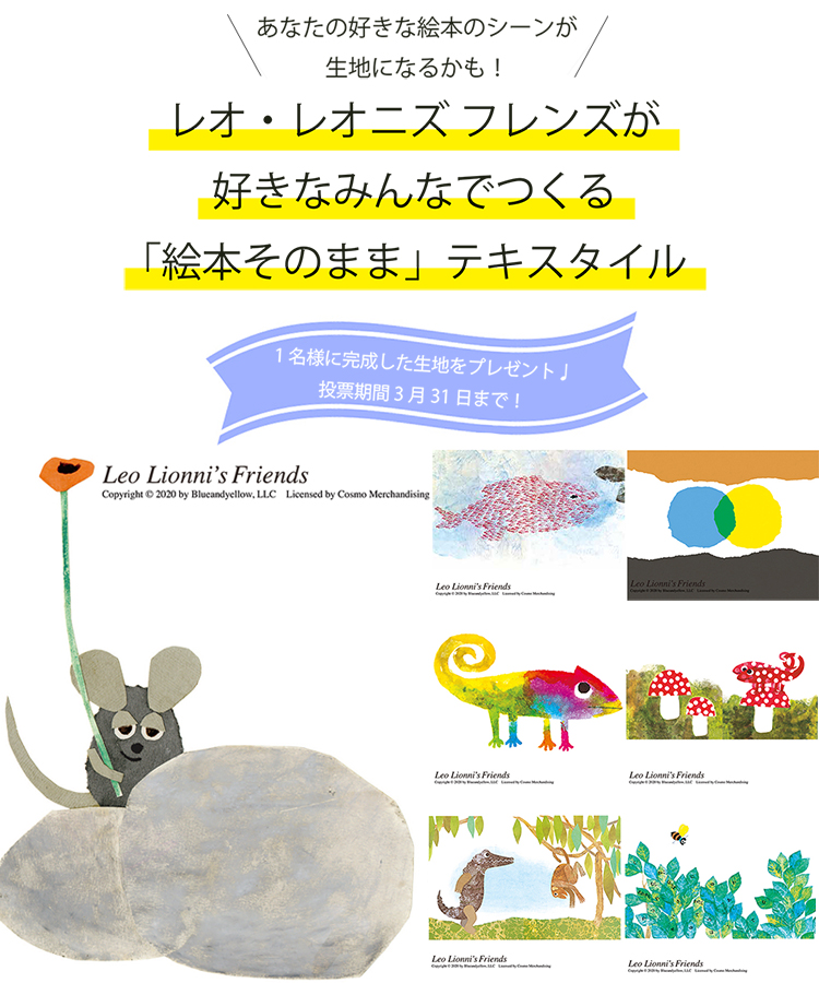 「レオ・レオニズ フレンズ ファンのみなさんに本当に喜んでいただける生地をつくりたい…!」ということで、今回は、生地にする絵本のシーンをみなさんの投票で決定させて頂くことになりました!