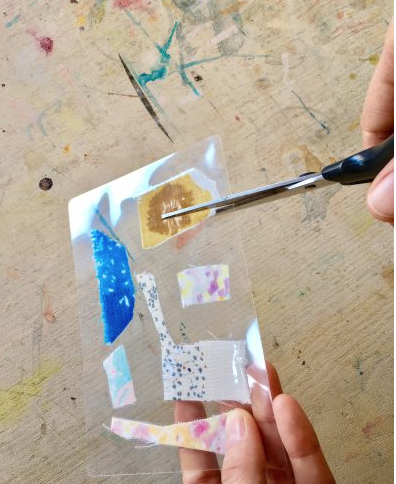 ハガキサイズのパウチから自由なかたちに切りだしてアートワークを楽しめます。