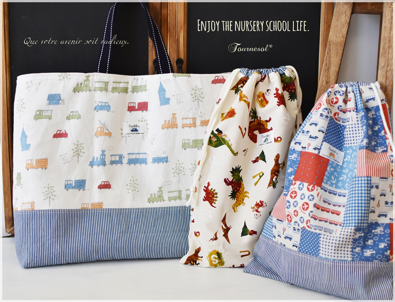 ▲武井さん作。恐竜や乗り物など、男の子が好きな柄を使ったレッスンバッグと体操服袋。