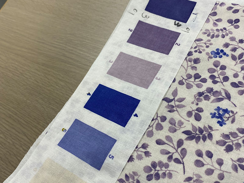 生地サンプルを手にとると、どんな色を使って染めたかがわかるよう、小さな色見本が留められていました。販売されている生地にはついていないので、これまた興味津々。