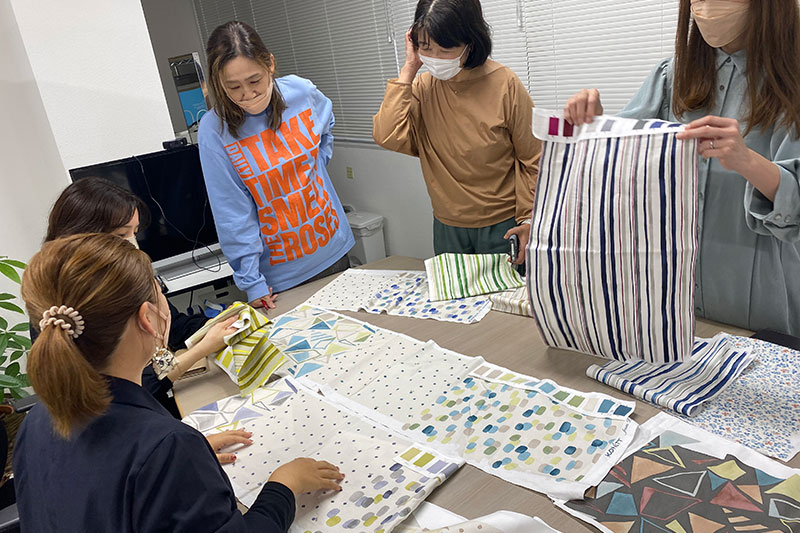 第4回目のミーティングでは、染工場から上がってきた生地サンプルをみんなでチェック。いくつかの配色パターンででき上がった生地から4〜5色、絞り込んでいきます。