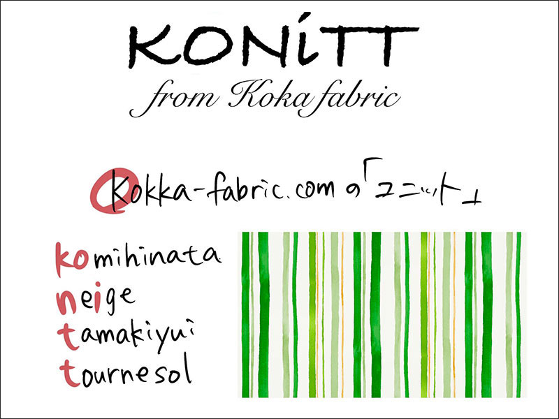 生地サンプルを広げると、まず目に飛び込んできたのは、布端に印刷された「Konitt(コニット)」という言葉。この生地のシリーズ名です。