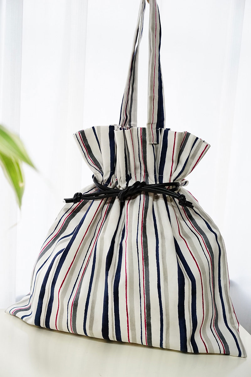 田巻:「しましま」は、使いやすくて気に入っている巾着バッグのレシピで仕立てました。結果、ほどよい歪みラインが切りやすく、縫い合わせ部分もきれいに仕上がりました。「しましま」はすっきりした印象で普段使いにぴったりです。