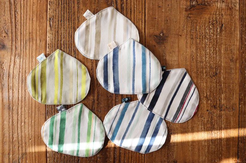 猪俣:使ってみると、コースターの中にドットがぽつんと入ったりして、なんかいいなって思いました。裏面は「しましま」です。ストライプというと、まっすぐに揃えないと歪んだ印象になってしまうところ、この揺らぎのあるストライプはそういう心配もなく、合わせやすかったです。同じ形でも色が変わるだけで違う表情になって、作る時間も楽しめました。