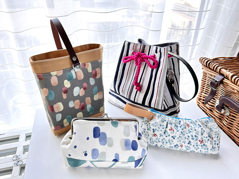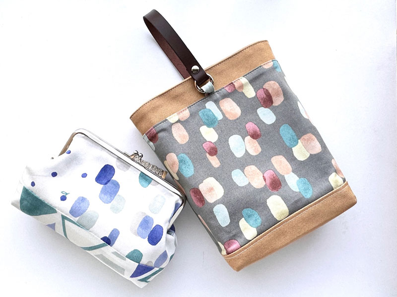 杉野:「まるさんかくしかく」は1枚の中の3種を合わせて作りました。隣り合わせの柄はそのまま使ってその二柄に被るようにもう一柄を乗せて合わせています。レザーと丸カラビナでハンドルをつけたのは、「まるさんかくしかく」の「しかく」だけを使ったバッグ。使う場所によっても、選んだ色によっても、全然違う雰囲気にできるのが、楽しいですね。