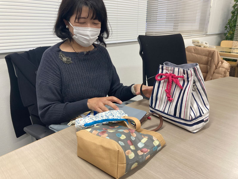 杉野:「しましま」を使った巾着バッグを作ってみました。1種類の布を縦横で向きを変えて使うことで動きを出しています。