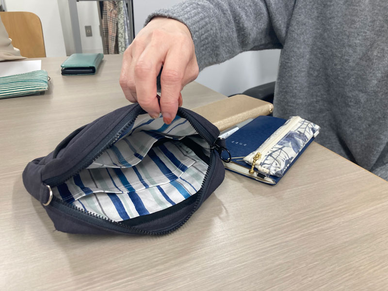 武井:内布に使ったときの柄の出方などの雰囲気を確かめたくて、こんなふうに使ってみました。「しましま」の手描きのようなゆらゆらしたラインは、直線がずれていないので裁断時にとても切りやすく、縫う際もガイドラインになって縫いやすかったです。