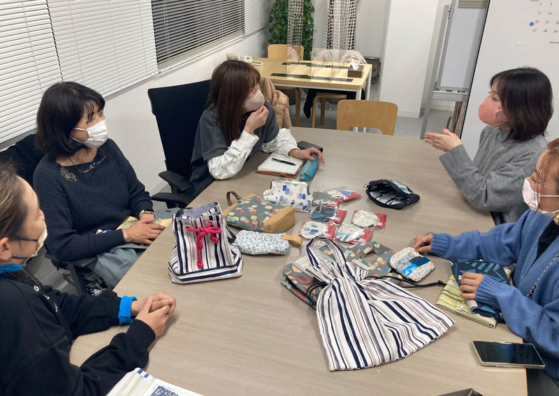 昨年11月には、生地づくりの工程を見学するため、京都の染工場にも訪れました。昨年末、ついに生地が完成。さっそく各々で作品を作ってみて使い心地をチェックしました。今回は、作りたてホヤホヤの作品を持ち寄っての意見交換会です。