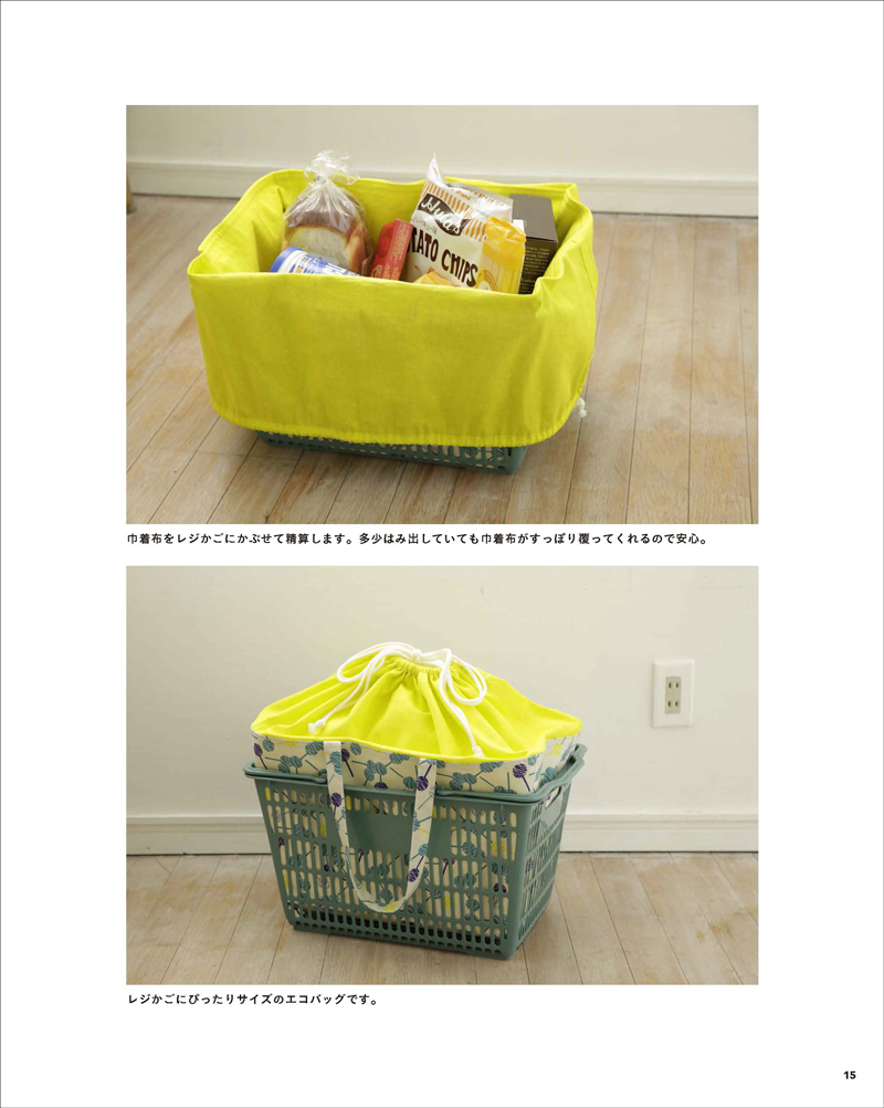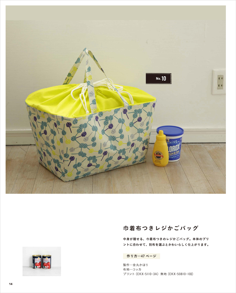 「巾着布つきレジかごバッグ」の表布は、tauytouのEKX-5110-3A、内側の無地は同じくtayutouで、EKX-50810-10I。