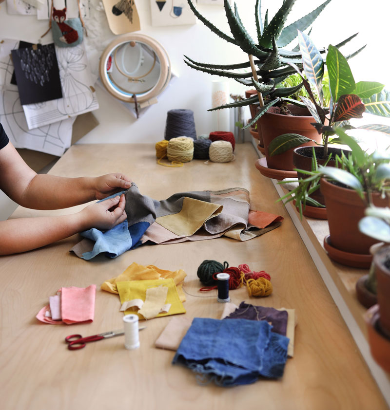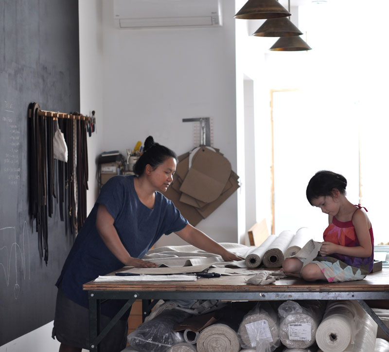 毎日の暮らしは、まず1階に降りていって、出荷待ちのオーダーを準備することから始まります。そして作品づくり。印刷したり、縫ったり、仕上げをしたり。近所に住んでいる私の母が縫うのを手伝ってくれます。
