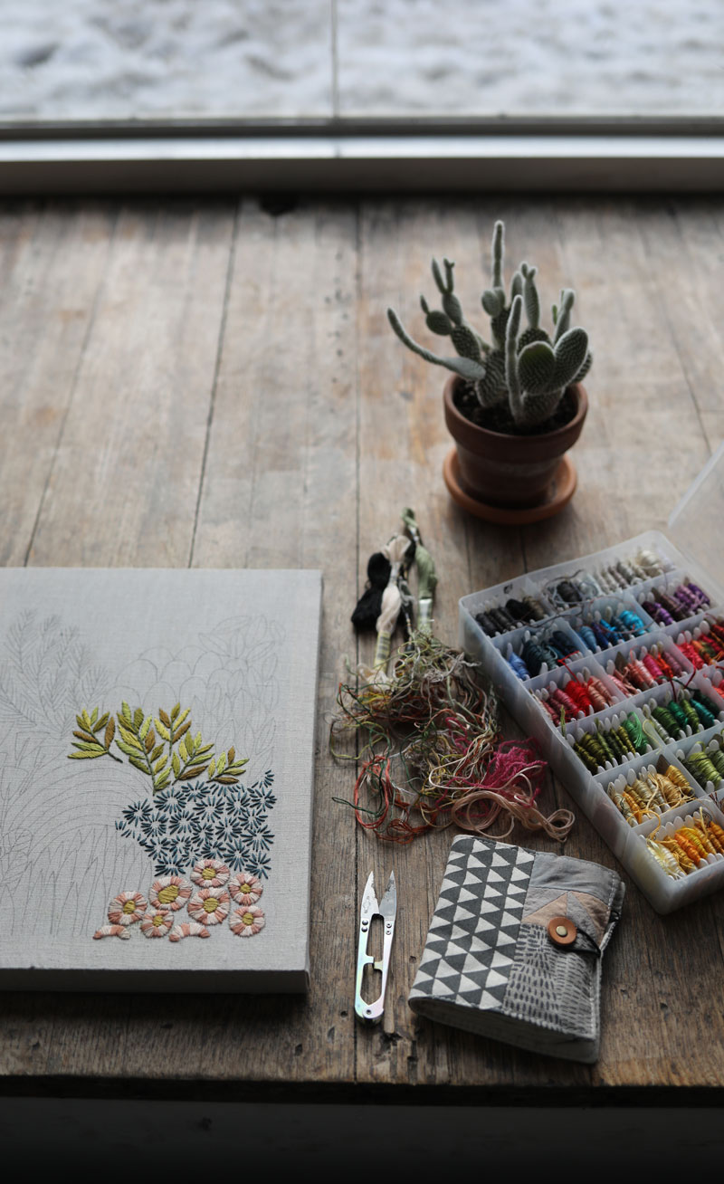 インスピレーションの源は、葉や花、植物といったボタニカルな世界です。近所を散策中に見つけたもの、写真や絵など、常に植物に関心を寄せています。作品づくりはいつも手でスケッチすることから始めるので、不完全なものやイメージを繰り返すときに生まれるバリエーションが好きなのです。手から生み出されるものは、自然界に存在するオーガニックな形に似ています。パッチワークの構成を組んでいると、自然界と同じような組み合わせやバリエーションを見出したりするんです。