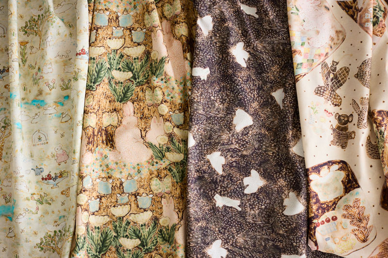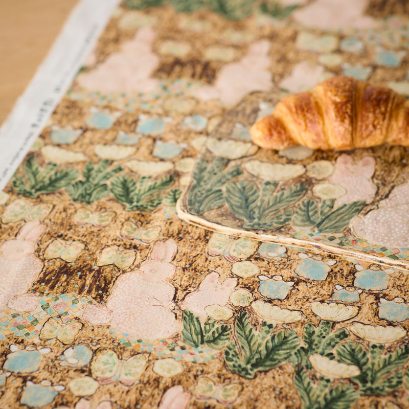 陶芸では落ち着いた色味でしたが、生地になると明るくはっきりして、かわいらしい印象になったと思います。特にピンクのうさぎが愛らしく、見る人が幸せな気持ちになれたら嬉しいです。