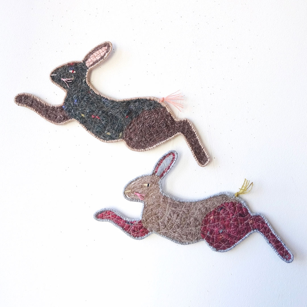 ぴょんと跳ねるウサギたちの中にキツネとトナカイも混ざっていて遊び心も感じる楽しいデザインです。