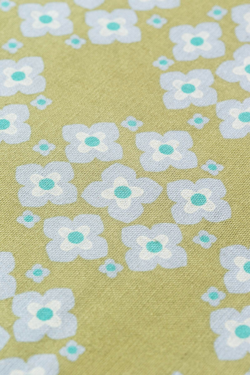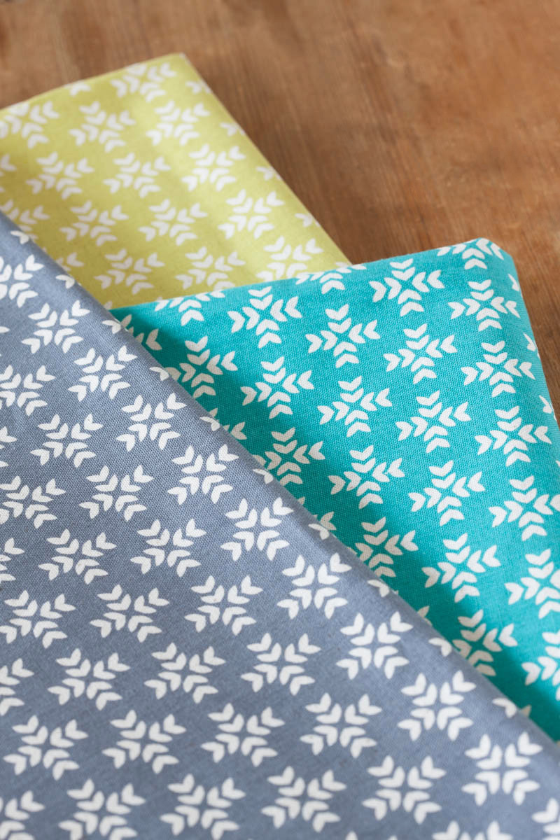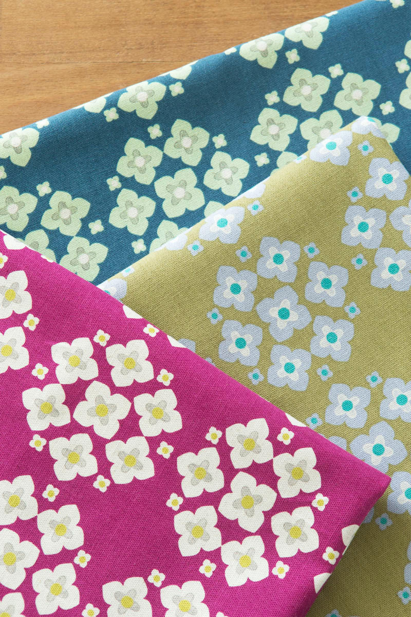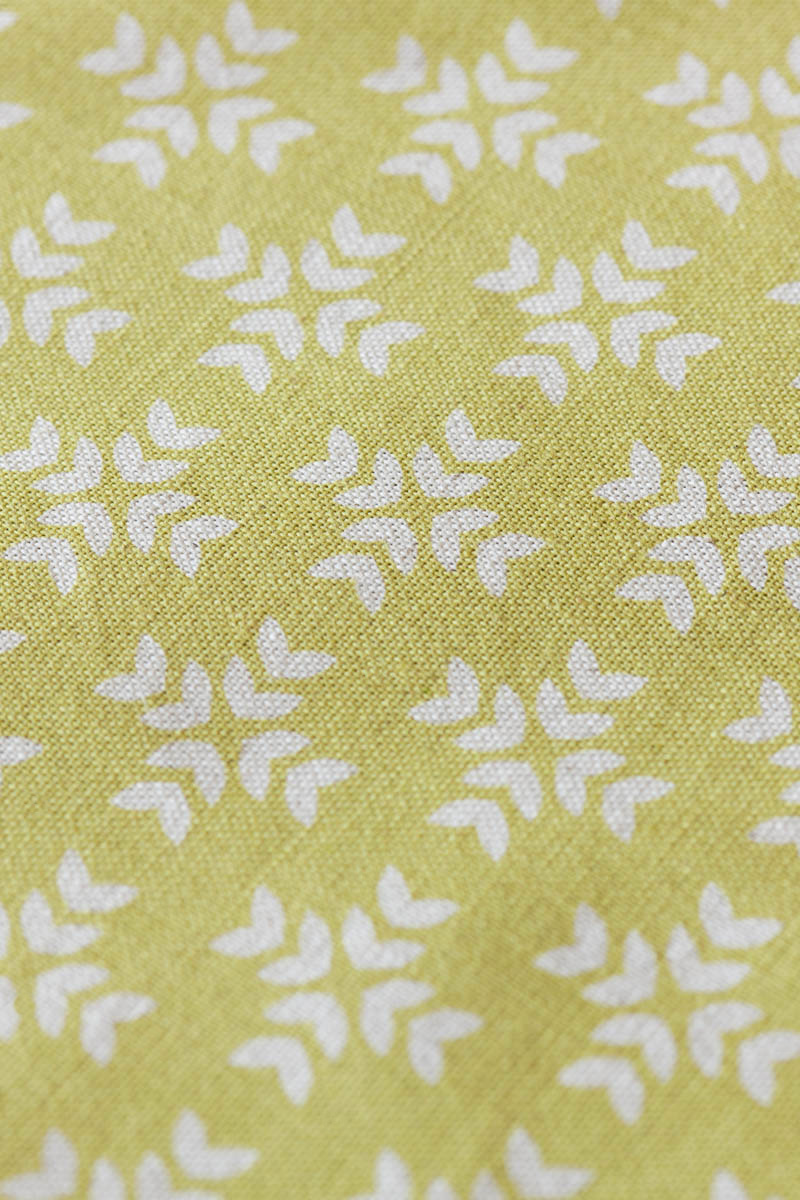 クロスした葉っぱモチーフの小柄です。「ほかのどんな柄とも調和しやすい、「GARDEN」シリーズのベーシックな柄。バッグやキルト、ホームデコレーションなど、さまざまなアイテムに使える万能選手です」(エレン・ベイカーさん)