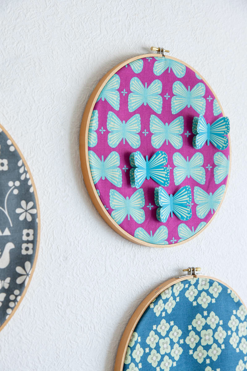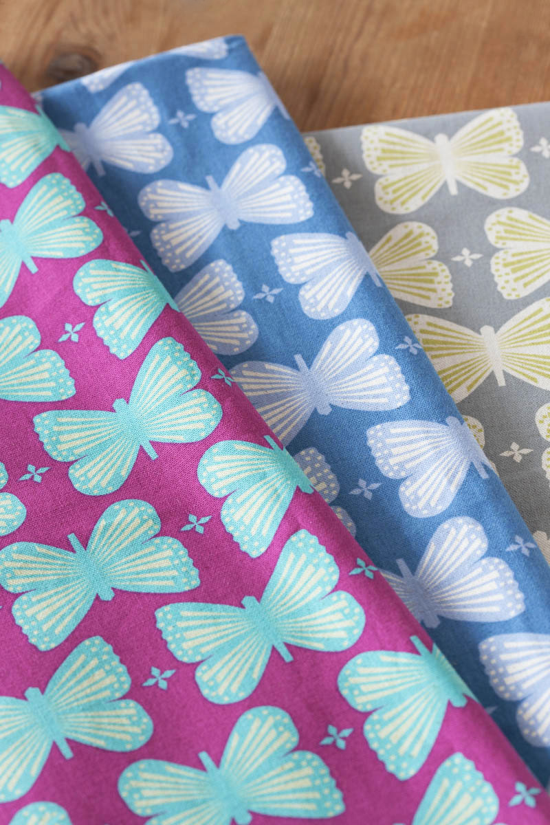 「印象的なチョウチョ柄は、家庭で使う布小物にぴったり。洋服に仕立てても美しいですね」(エレン・ベイカーさん)色合いで違った印象が楽しめるのも魅力です。