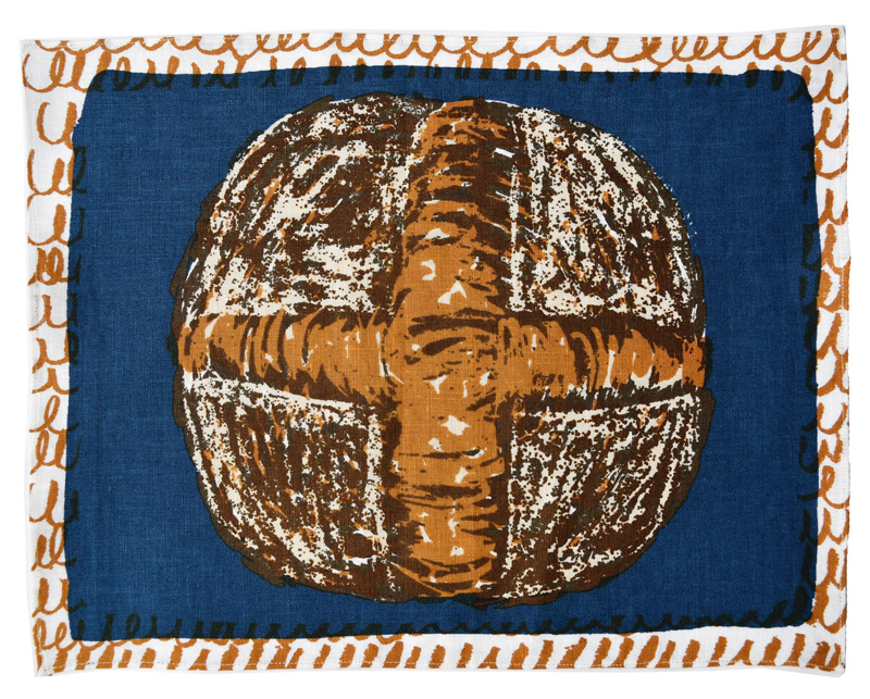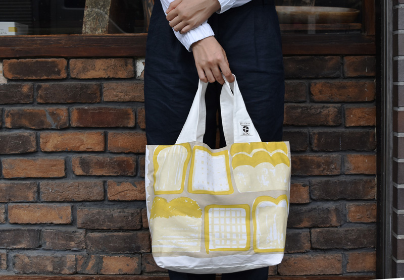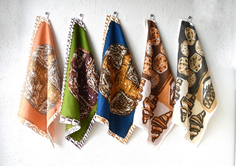 今回の展示は、なんと、代々木上原の伝説的なパン屋さん、ルヴァンとのコラボレーション。坂本さん描く新作のルヴァン柄の、キッチンクロスやバッグなどが並びます。