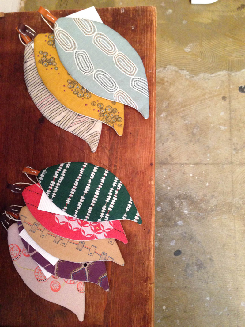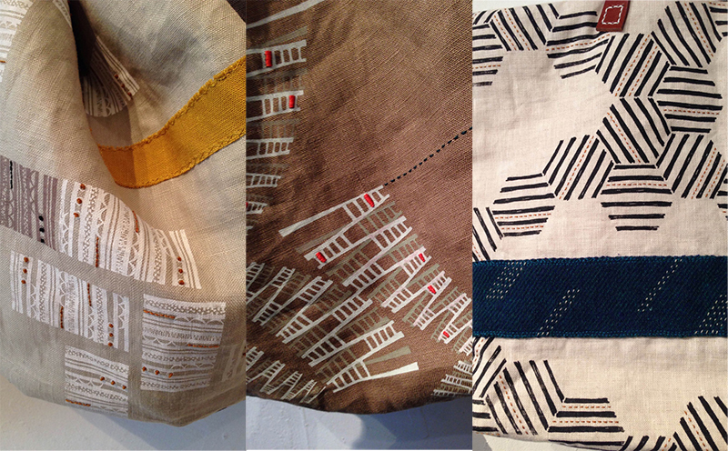 「ステッチはたいてい作品に仕立てる前に行ないます。『この色のプリントにはこの色の刺繍糸』のようにだいたい決まっています。作品に使う布はリネン地、しかも寒色系が多いので、刺繡糸はコーラルレッドなどの明るい色をポイントとして使うことが多いですね」(戸田さん)