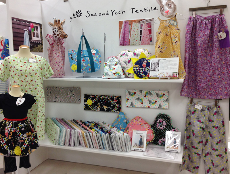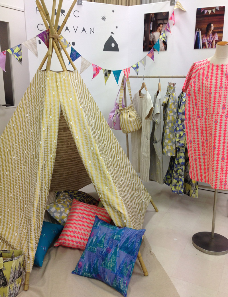 切り紙からインスピレーションを受けたということで、会場にも切り紙をディスプレイ。このシリーズでは、綿麻キャンバスとダブルガーゼを展開。craft&sawing のコーナーでご紹介したリボンつきワンピースやサークルバッグもディスプレイされていましたよ。