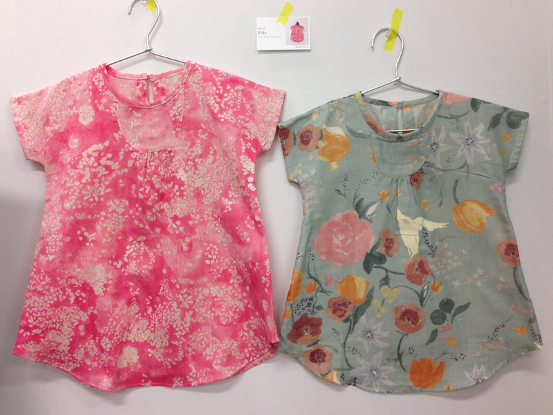 左側のピンクのフレンチスリーブの子どもワンピースは、「Lei nani」(レイ・ナニ)、美しい冠と名付けられた柄、「BUGEN」(ブーゲン)。花の姿を冠やレイにして贈る気持ちで最初から最後まで描いたそう。右側の布は、「Fucca :rakuen」。同じパターンでも使う布で印象が変わりますね。
