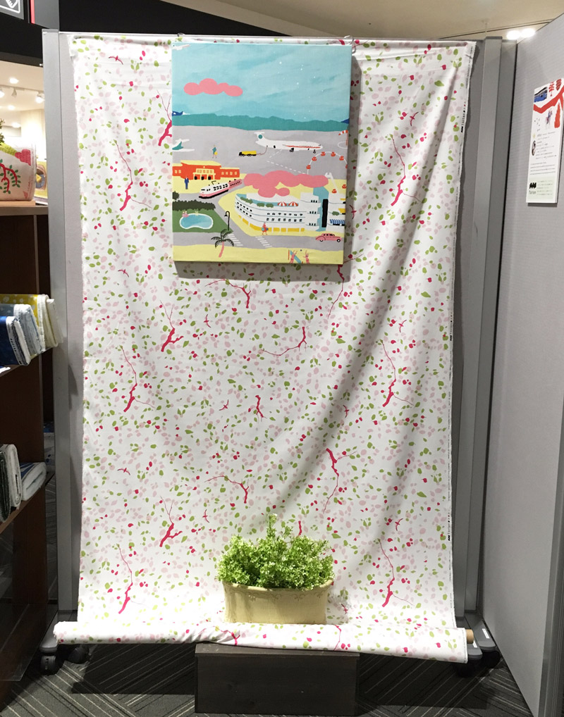 ドーンと壁にかかっているのは、KOMOREBI。木漏れ日のなかに鳥のさえずりが聴こえてくるようなとても爽やかな布です。その上に絵画のように飾られているのがCINEMA。様々な旅の記憶と重なって、ああ、なんか旅したくなっちゃいます。こんなふうにファブリックパネルにしてお部屋に飾ったら、いつもの空間もぐーんとおしゃれになりそうな予感……。