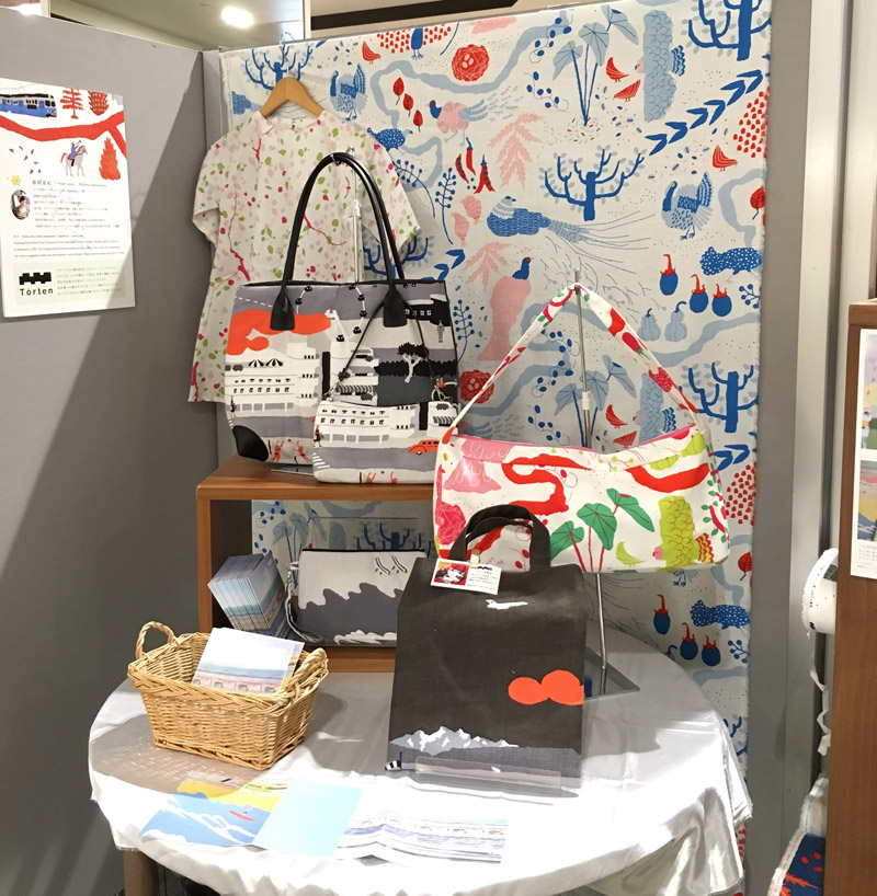 「Törten」で作ったバッグやポーチのサンプルも。壁にかかっているのは、WATASHI NO NIWA。10羽の鳥と裏庭にごろごろと広がる野菜を描いた柄だそう。
