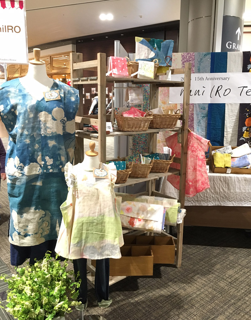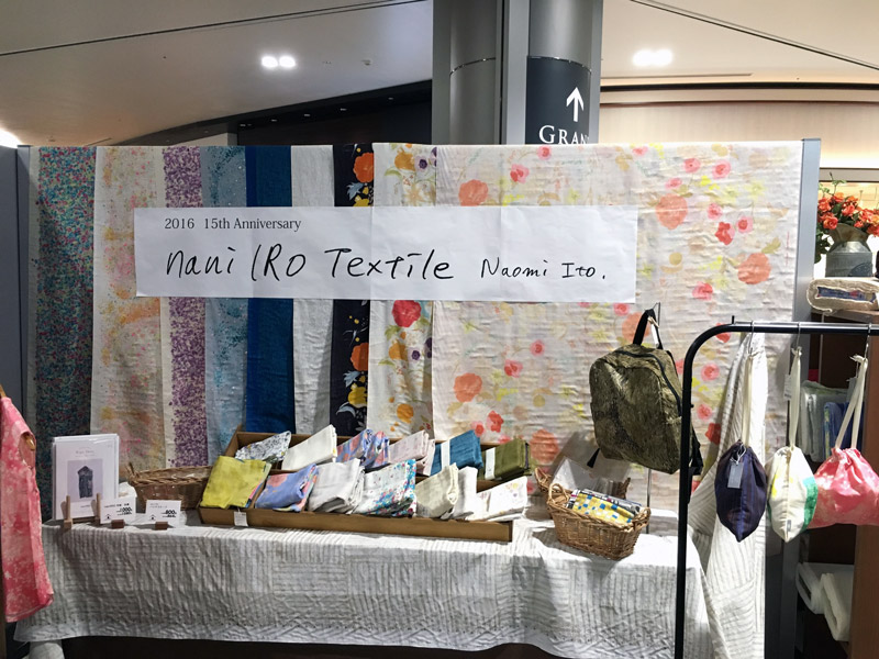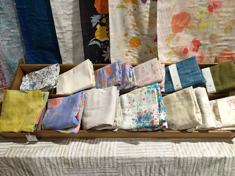 こちらは、今年15周年を迎える伊藤尚美さんのnaniIROシリーズのコーナー。タペストリーのように壁一面に飾られているのがnaniIROの新柄です。1枚の布は一幅の絵画のよう。布いっぱいに広がる伊藤尚美さんの世界、その叙情的な美しさに心がときめきます。