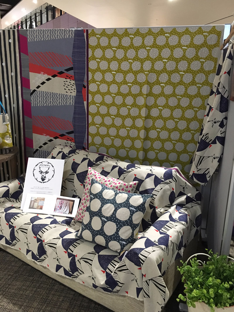 インテリアファブリックとしてファンも多いechino。コッカの展示会でも今まで数々のインテリアシーンを提案してきましたが、今回のイベントもソファカバーやクッションとしてお目見えです。壁に掛かっているマスタード色の柄が「den」。2016年1〜3月で販売ランキング1位を独走中の人気柄です。