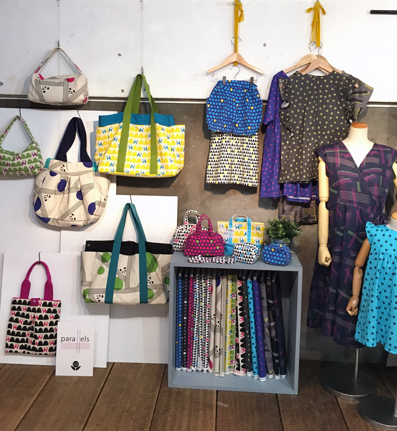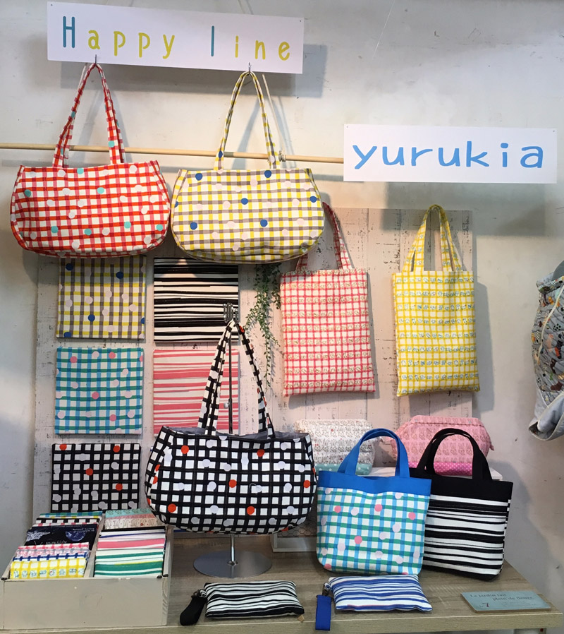 いろんなバッグが勢揃いしたこちらのコーナーは「happy Line」(ハッピーライン)と「yurukia」(ユルキア)。