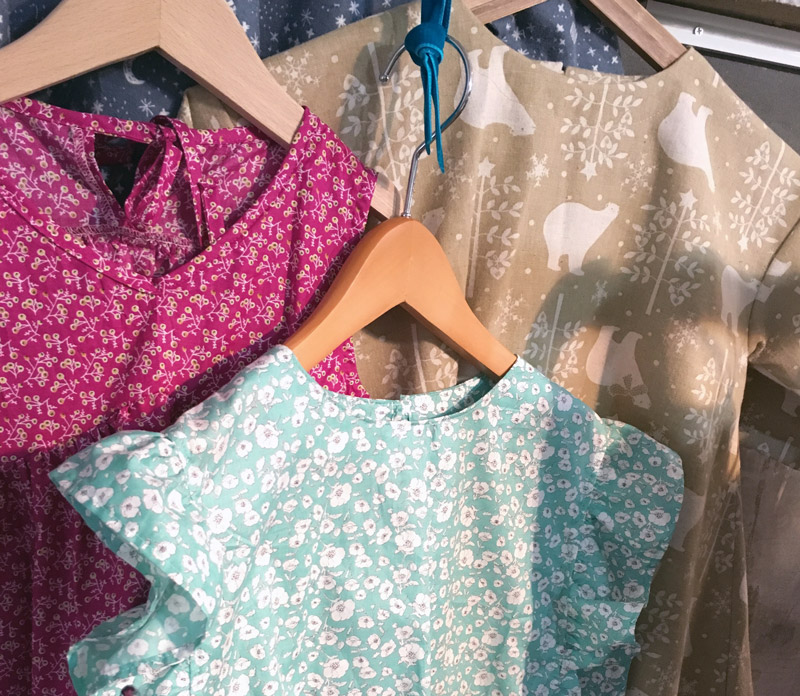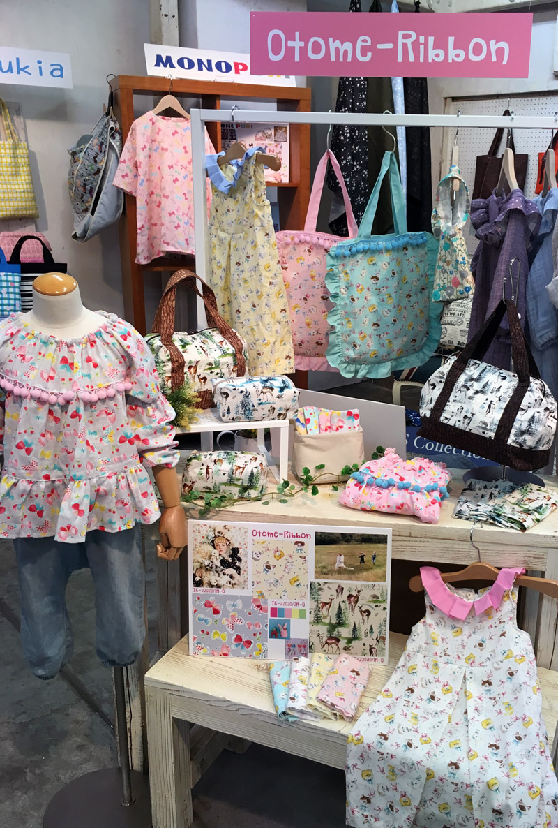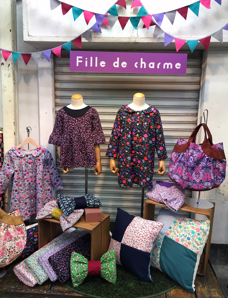 そしてこちらは、「Fille de charm」(フィルドチャーム)。鮮やかな色合いの花柄です。トルソーやハンガーに着せたお洋服は、ふんわり&しっかりな質感が嬉しいダブルガーゼの両面起毛。総柄なので、柄取りに迷うことなく、ホームソーイングが楽しめそう。