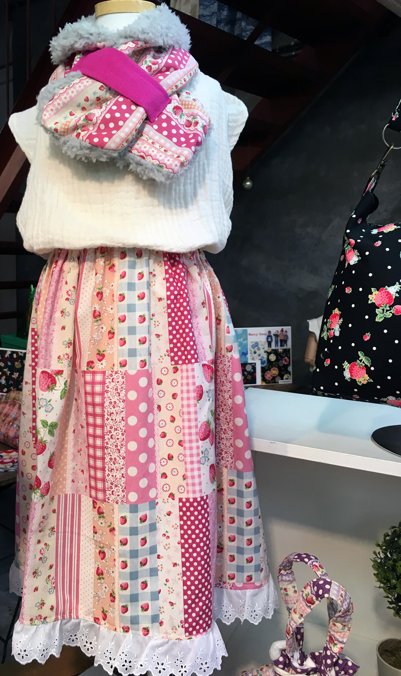なんとも可愛いいちご柄のスカートは「ベリーコットン」シリーズ。この生地はパッチワーク柄になっているので、1枚でこんなふうにボリューミィな雰囲気に。いちご、ドット、ストライプ……と、女の子が大好きなモチーフがぎゅっとつまっているので、洋服、バッグ、小物などいろんなアイテムを作りたくなりますね!