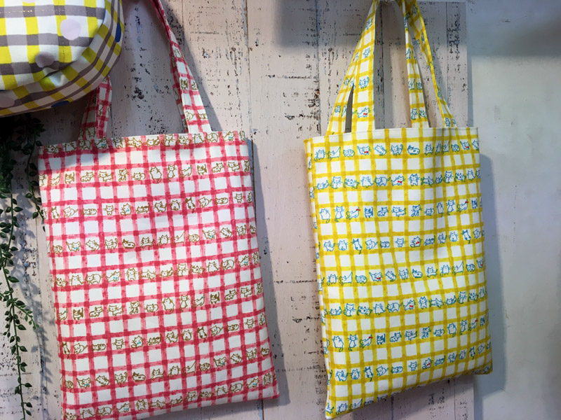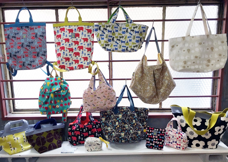 ミニトートからリュックまで、ずらりと並んだバッグコーナー。どの柄もしっかりとした綿麻生地です。デイリーバッグにぴったりな大きめの花柄や豆柄は「シンプルノルディック」シリーズ。可愛すぎないグラフィカルなモチーフは、年齢や性別を問わず使えそう。右側の黒地に白い花の柄は、5月の販売ランキングで第1位になった柄です!