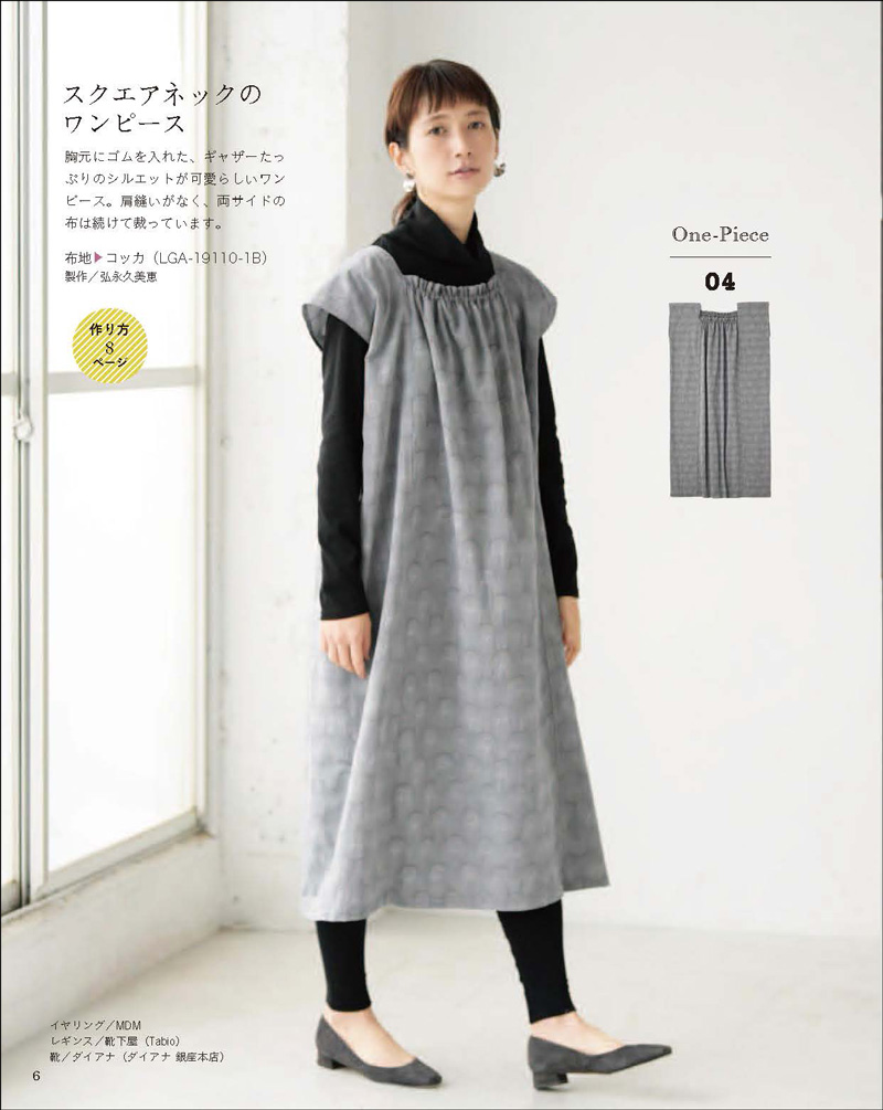 04のスクエアネックのワンピースの布は、先染めジャガード LGA-19110-1B。