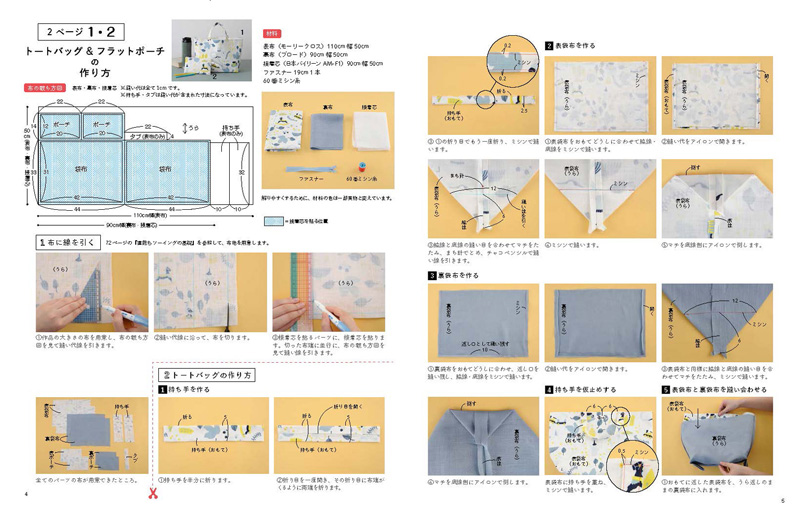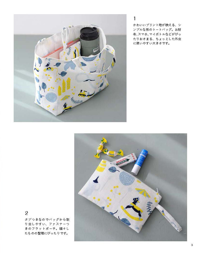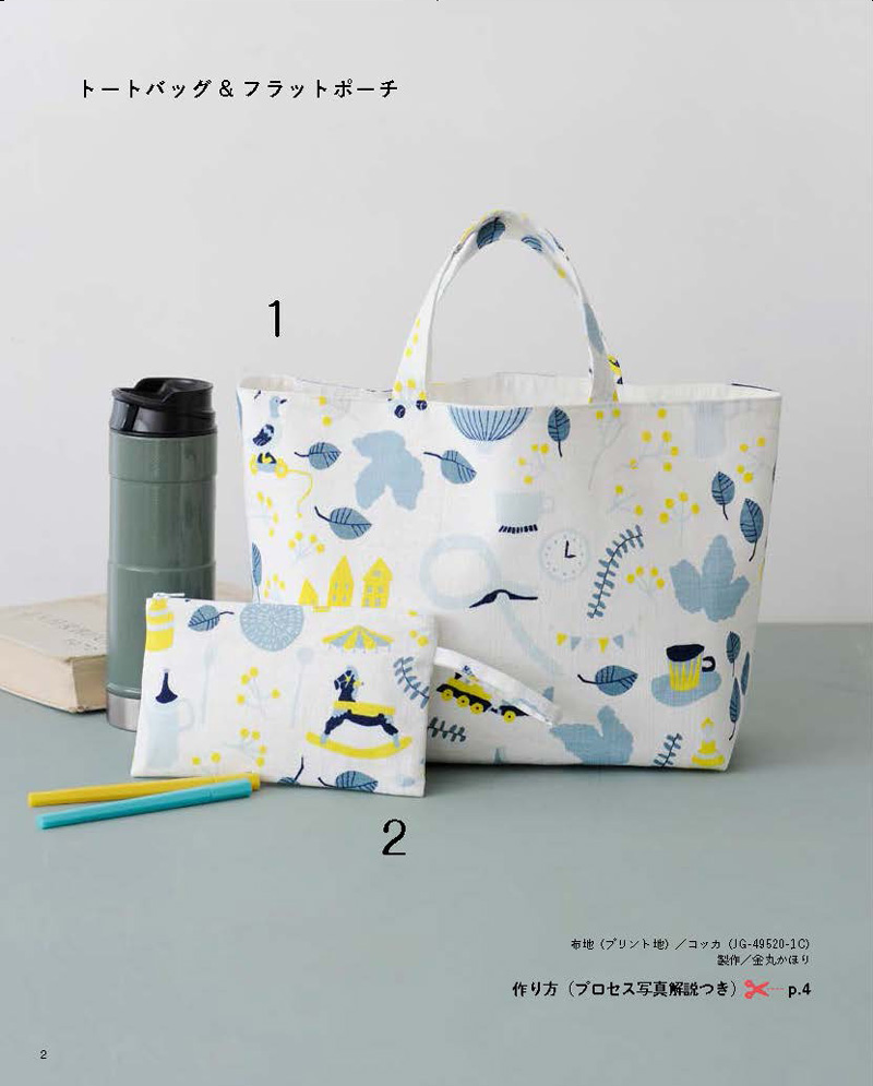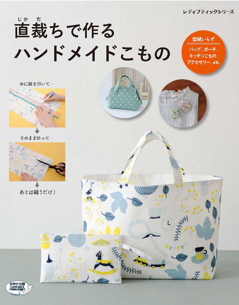 『直裁ちで作る ハンドメイドこもの』(ブティック社)に、コッカの生地を使った作品が掲載されています。使われているのは、イラストレーター、紙野夏紀さんがデザインした「Törten(テルテン)」シリーズのLIFE、JG49520-1Cです。なんと今回、表紙を飾っています!