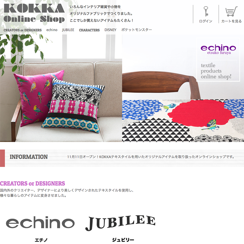コッカのファブリックで作った、インテリア雑貨や小物のオンラインショップがオープンしました!echinoやJUBILEEなど、国内外のクリエイターやデザイナーがデザインしたテキスタイルを使った暮らしのアイテムがいっぱいです。