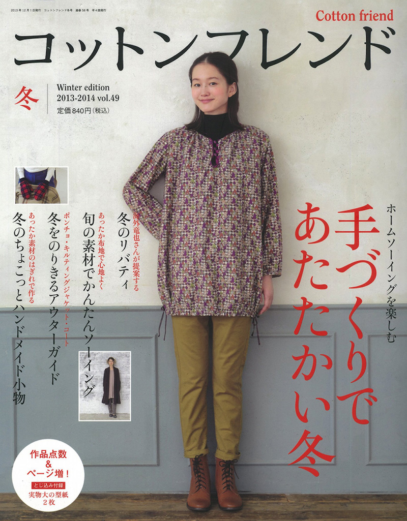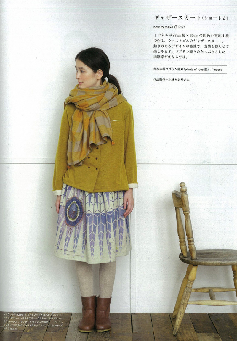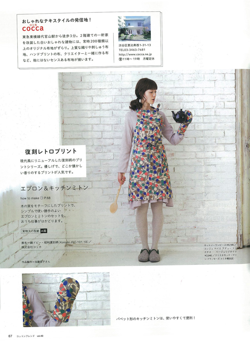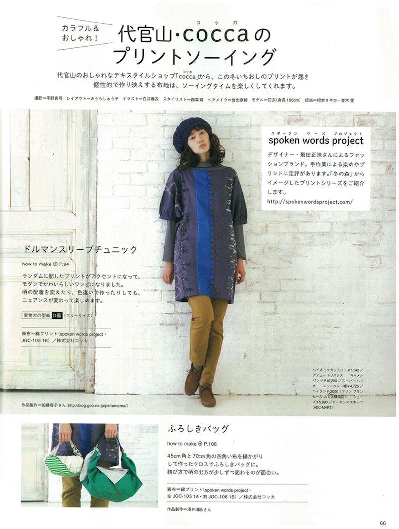 『コットンフレンド』vol.49に、「代官山・coccaのプリントソーイング」特集として、飛田正浩さんデザインのspoken words project の生地を使った作品が掲載されました。撮影:平野真弓 ©株式会社ブティック社