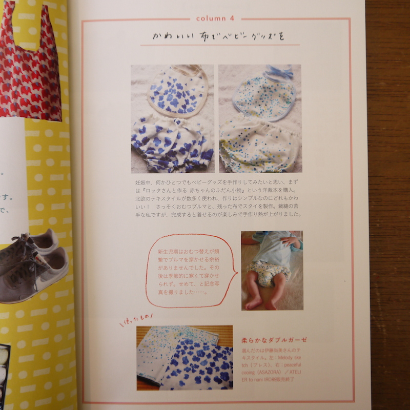 『「主婦」を楽しむもの選び 』では、「かわいい布でベビーグッズを」というコラムで、著者が作ったというおむつブルマとスタイが紹介されています。