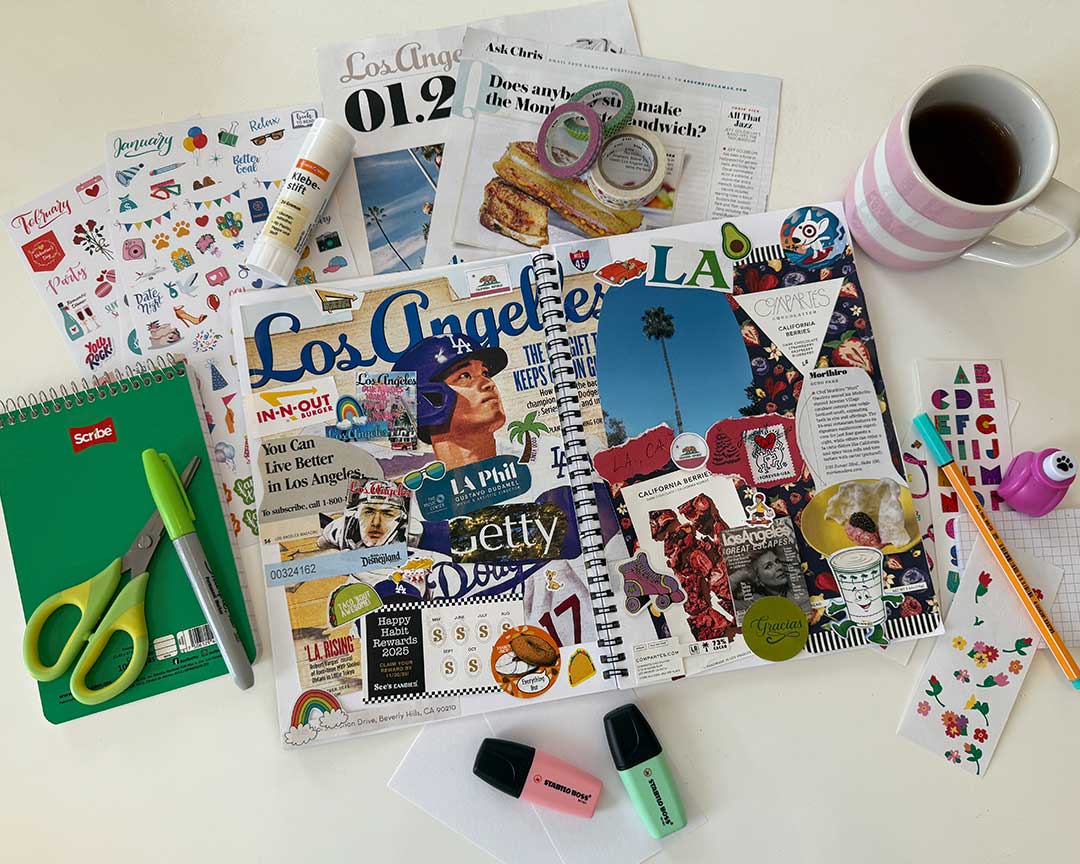 アナログ手帳派として、チケットの半券や思い出のシールを貼るなど、今までもジャーナリングに親しんできた私も、現在流行中のジャンクジャーナル作りに初挑戦。 “ロサンゼルス”をテーマに作ってみました。