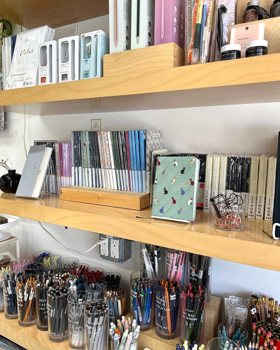 コーヒーショップとシェアする現在の店舗では、プランナーやジャーナルを彩るステッカーやペンが豊富に並び、オリジナルグッズも展開。ドジャースモチーフのステッカーは近くのスタジアムを訪れる日本人からも人気を集めています。